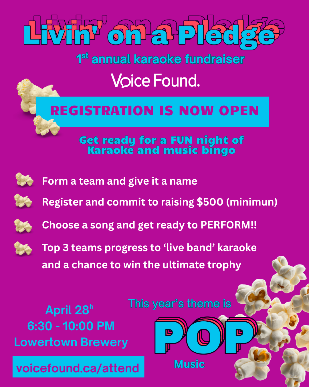 Show time: The evening starts downstairs with SHINE Karaoke with registered teams or individuals performing. When everyone has finished their epic performances we will tally up and then we move upstairs where the top 3 teams will perform with a LIVE band for a chance to win the grand prize!