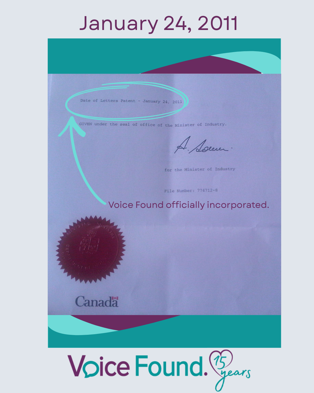 While the idea for Voice Found began two years earlier, it became real on the day we received our Letters Patent—the day Voice Found officially became incorporated.